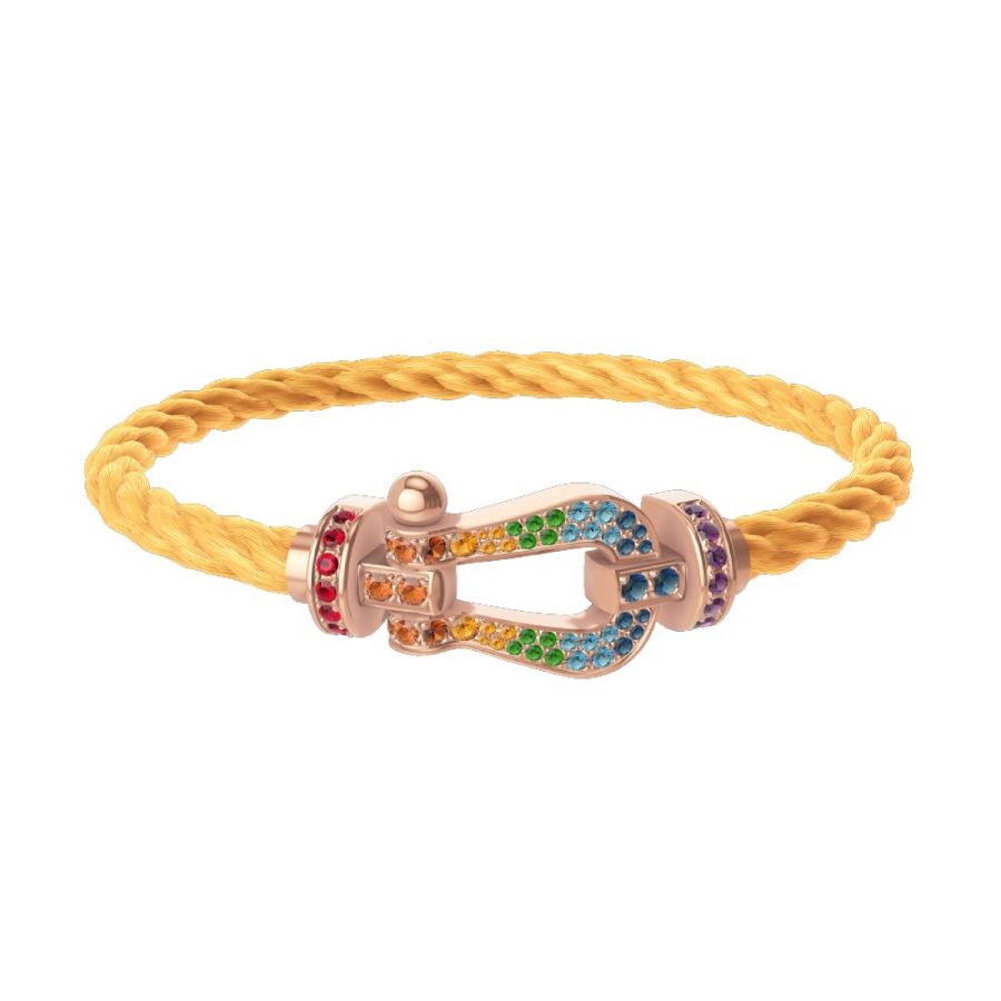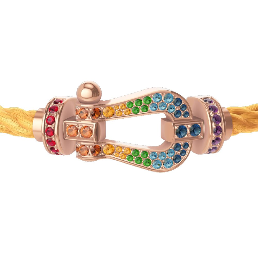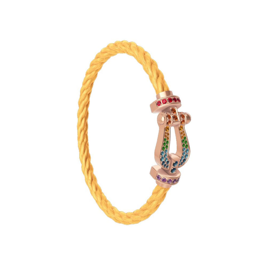 Cordino modello grande in nylon giallo ocra con estremità in oro rosa.