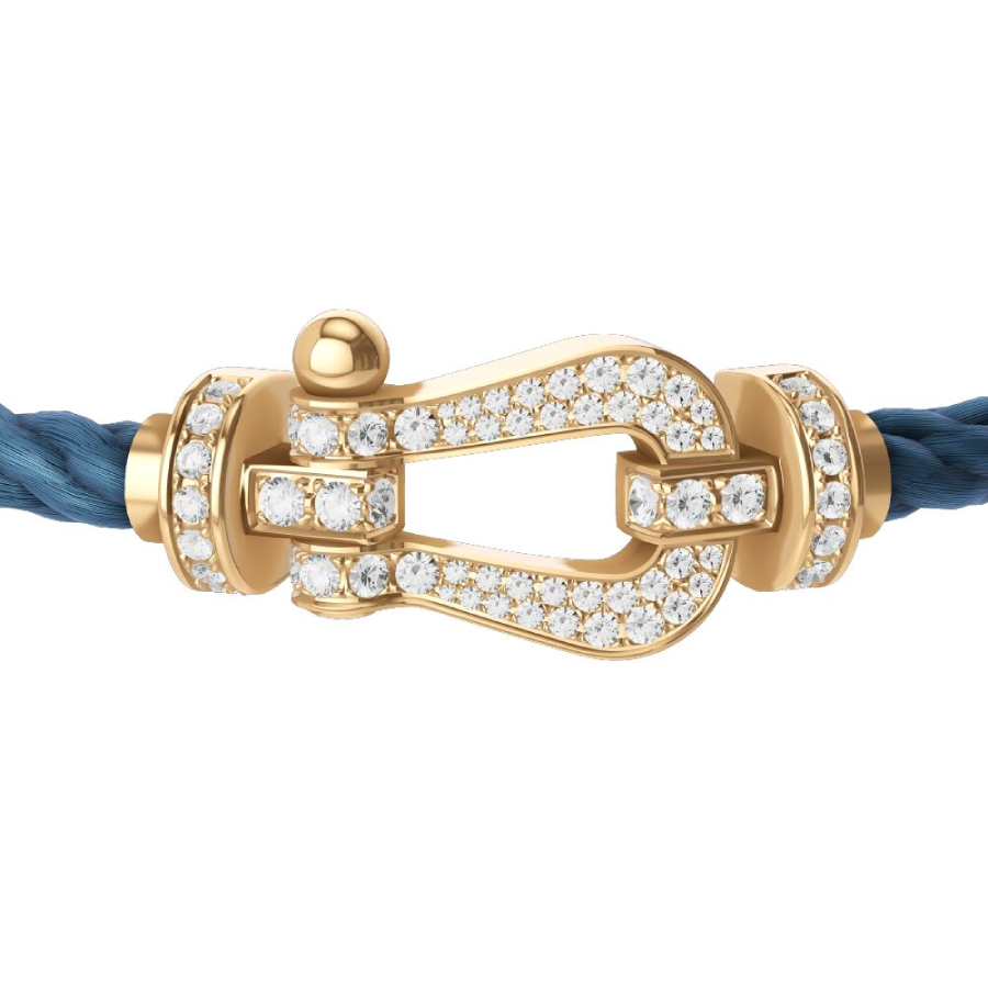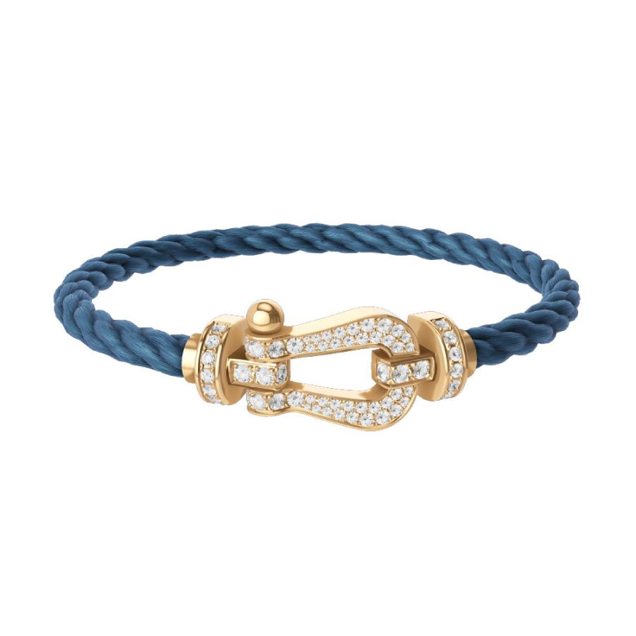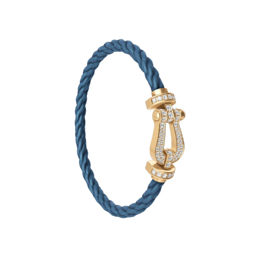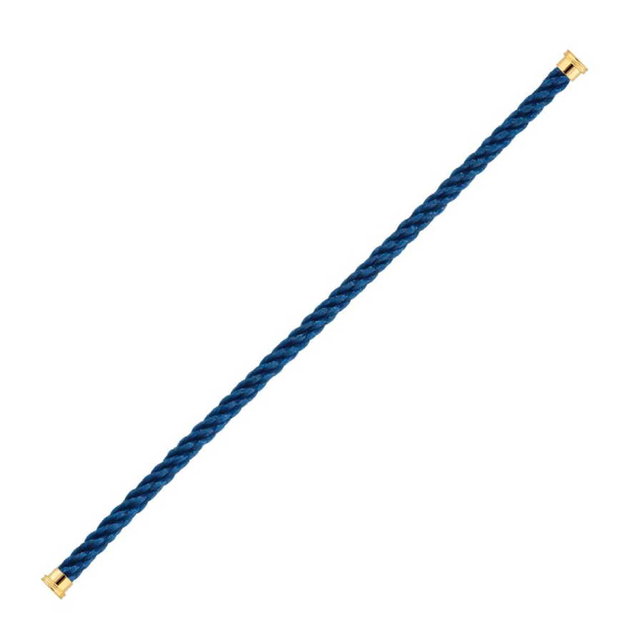 Cordino modello grande in nylon blu jeans con estremità in oro giallo.