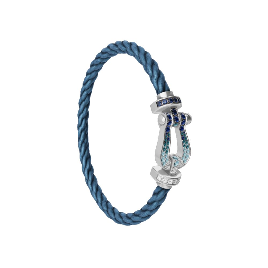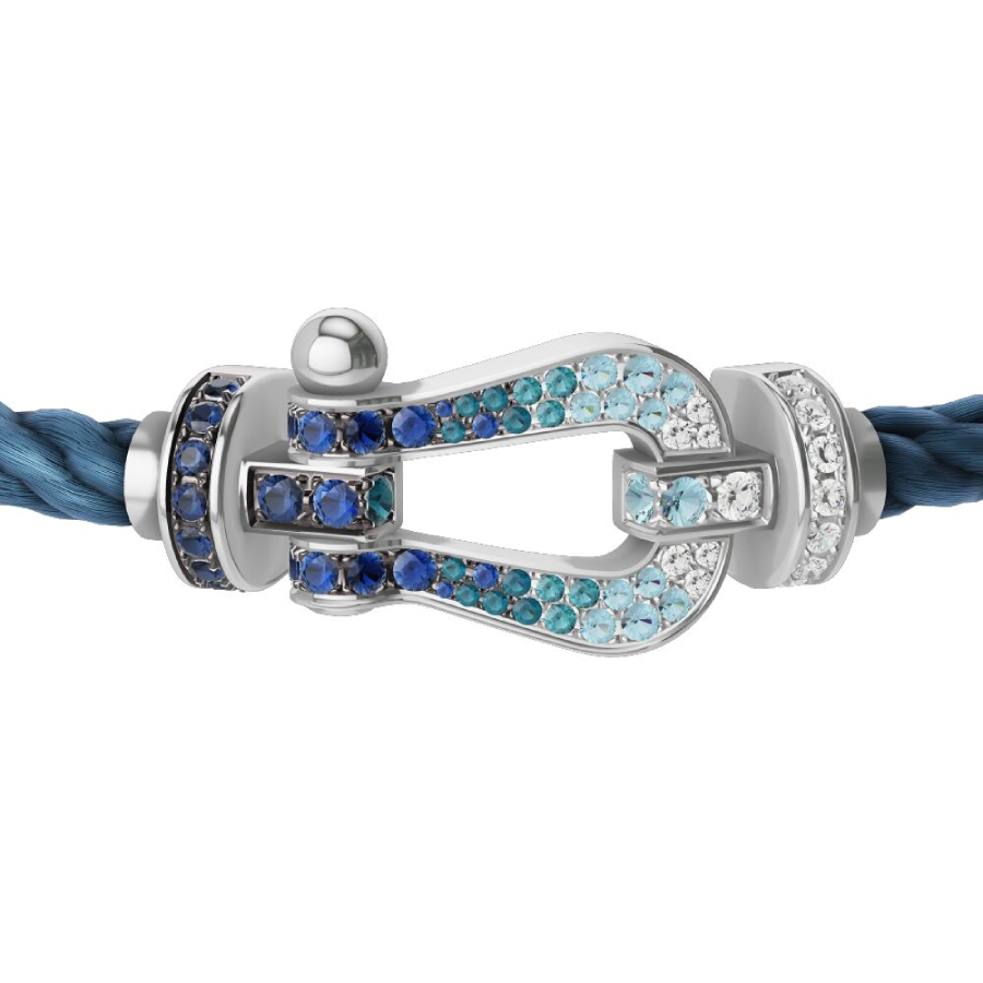 Cordino modello grande in nylon blu jeans con estremità in oro bianco.