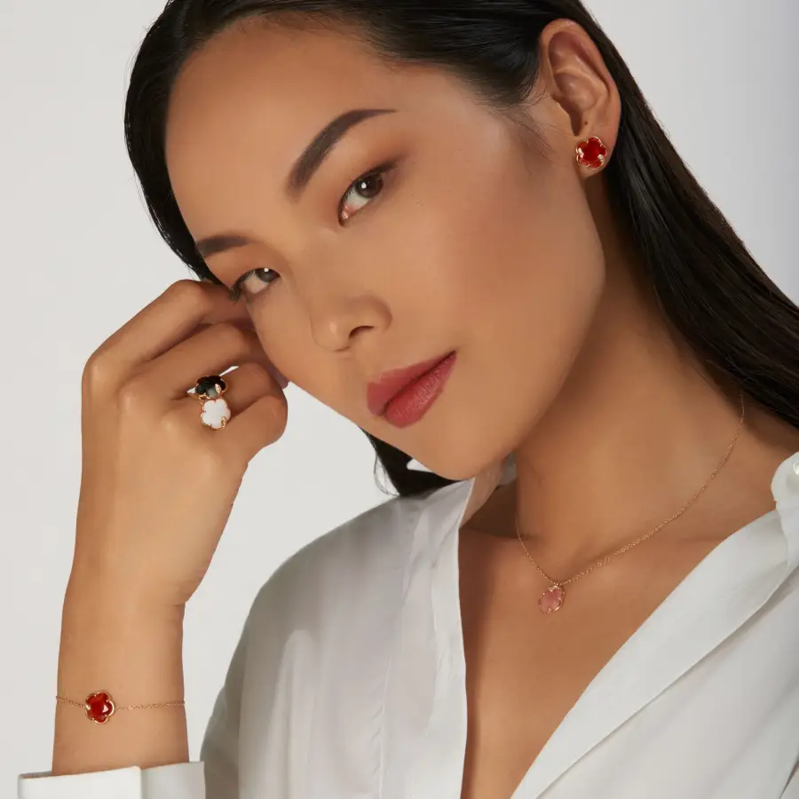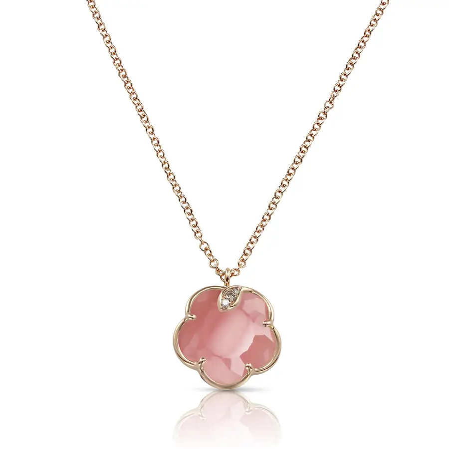 Collana Petit Joli in Oro Rosa 18 ct. Con Calcedonio Rosa, Diamanti Bianchi e Champagne.