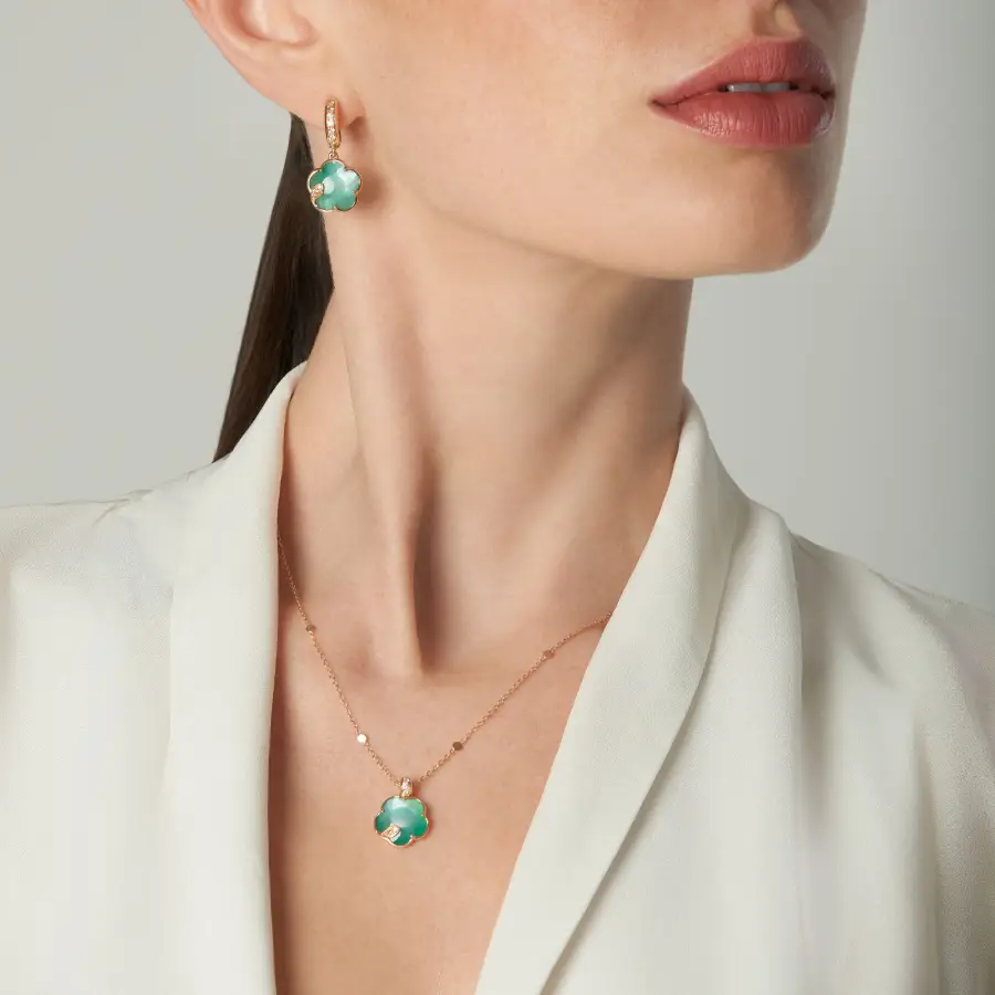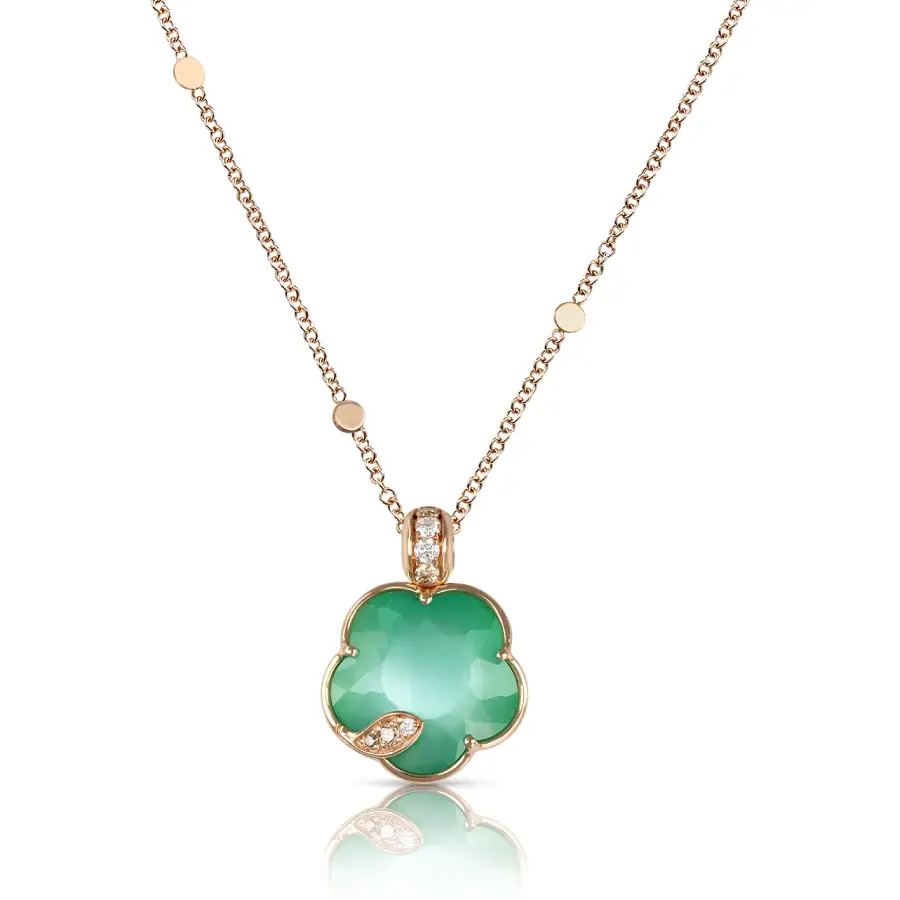 | Materiale | Collana, Lunghezza 42.5 cm Oro Rosa 18 Carati Diamante Bianco: 0.05 ct. Diamanti Champagne: 0.07 ct. Doppietta di Agata Verde e Pietra di Luna Bianca, Misura del Fiore 12 mm |