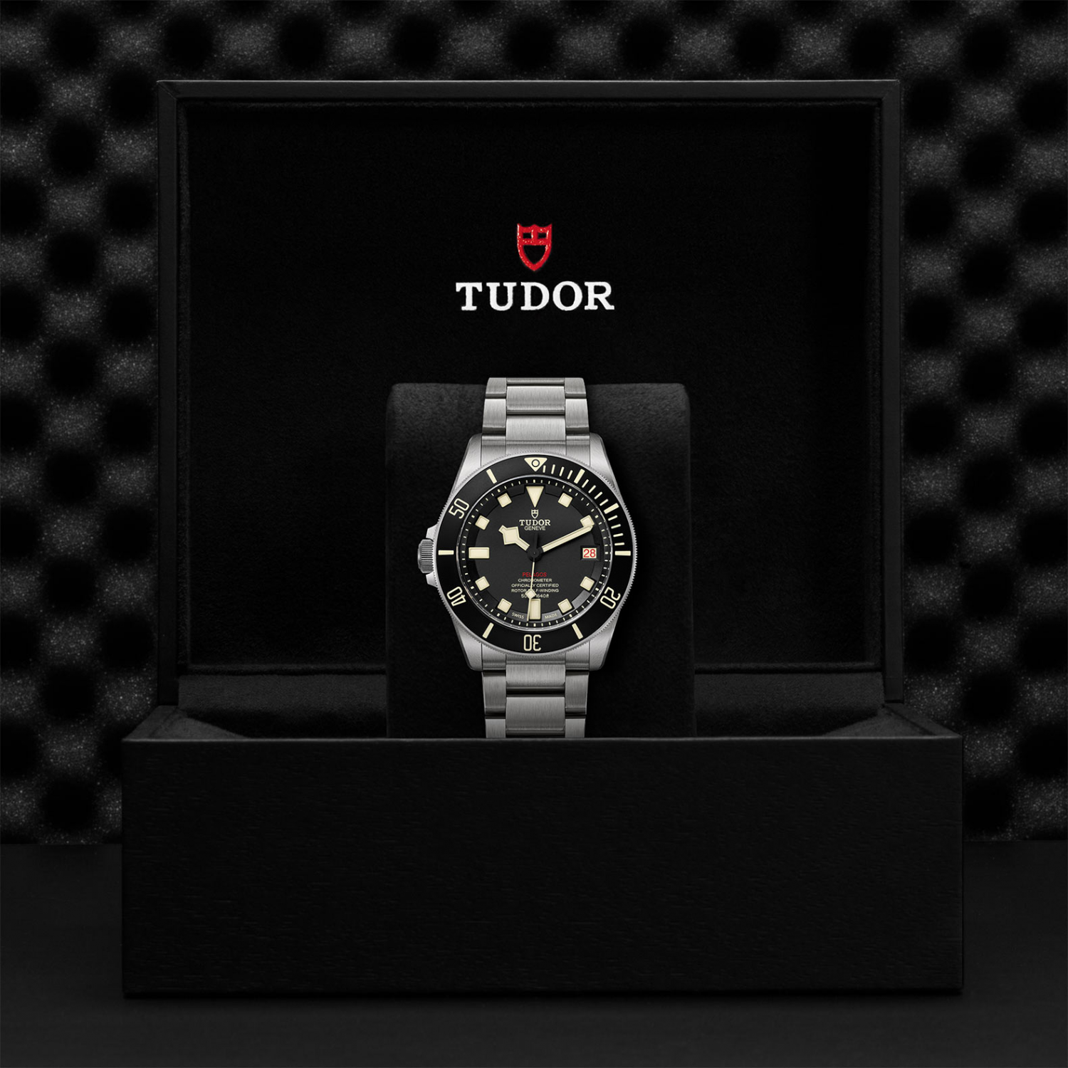 Corona di carica a vite in titanio a ore 9 con il logo TUDOR in rilievo Valvola automatica per la fuoriuscita dell’elio a ore 3